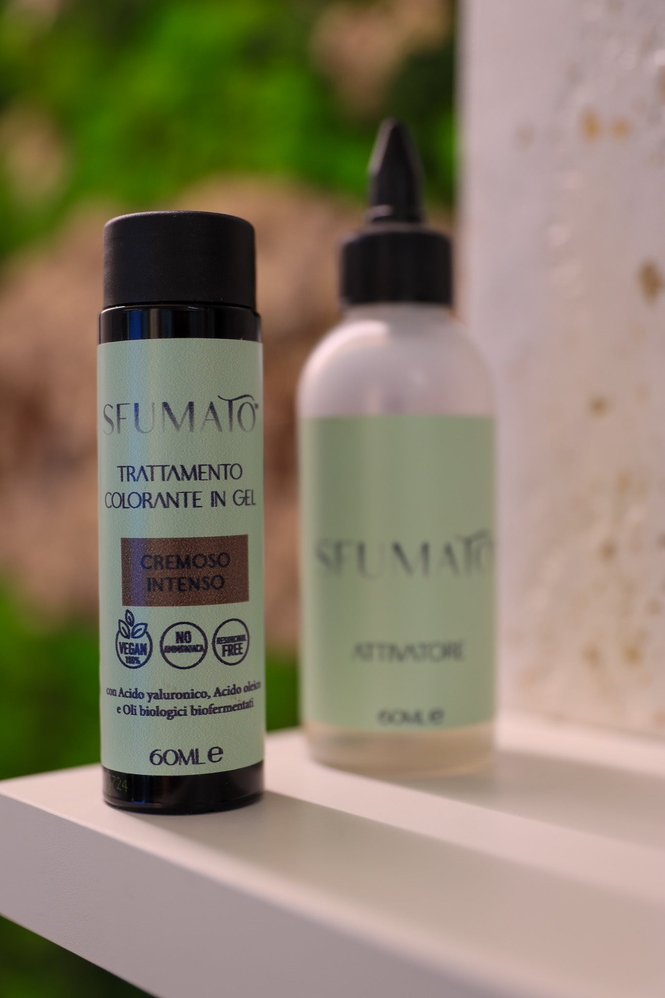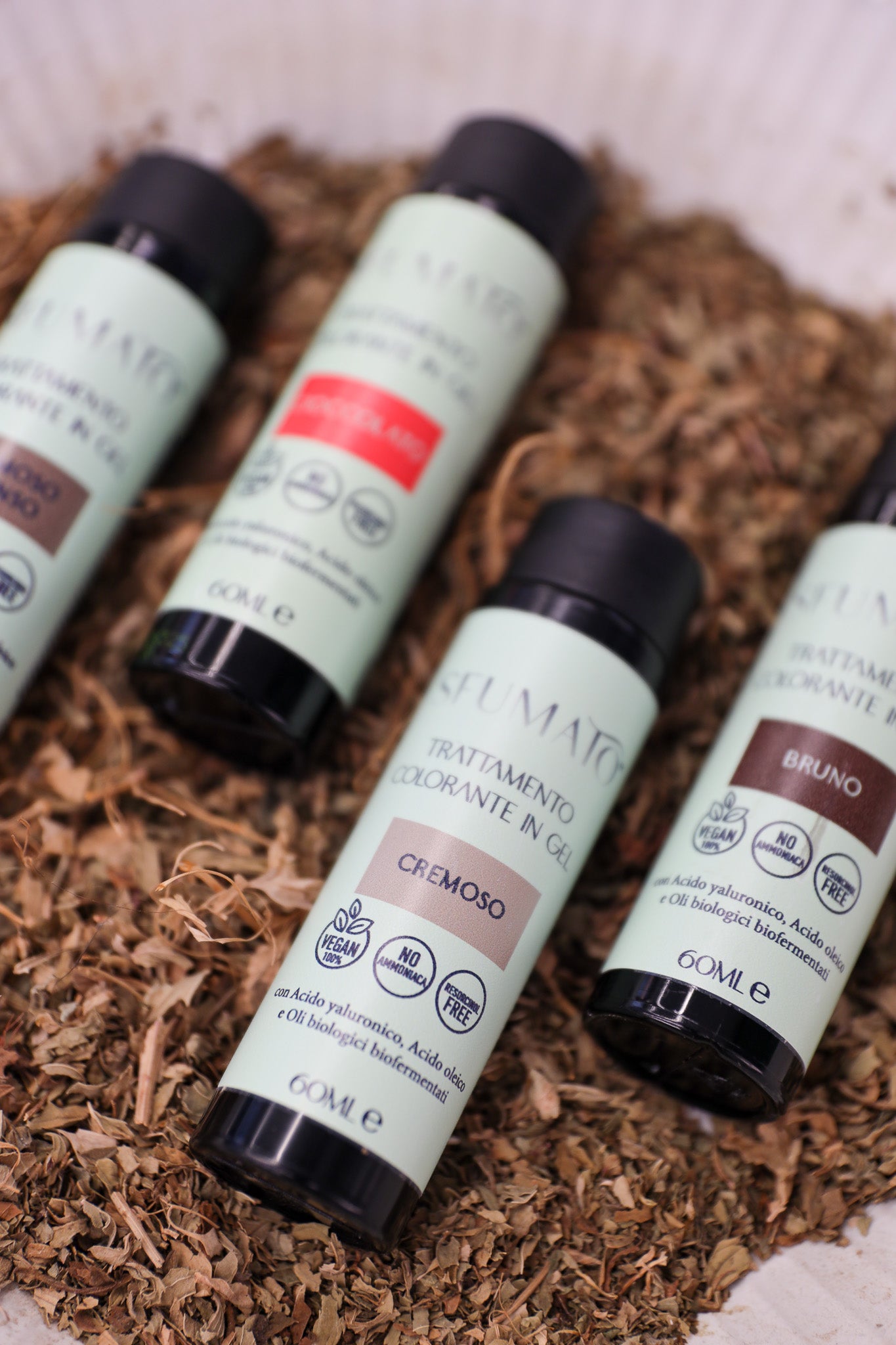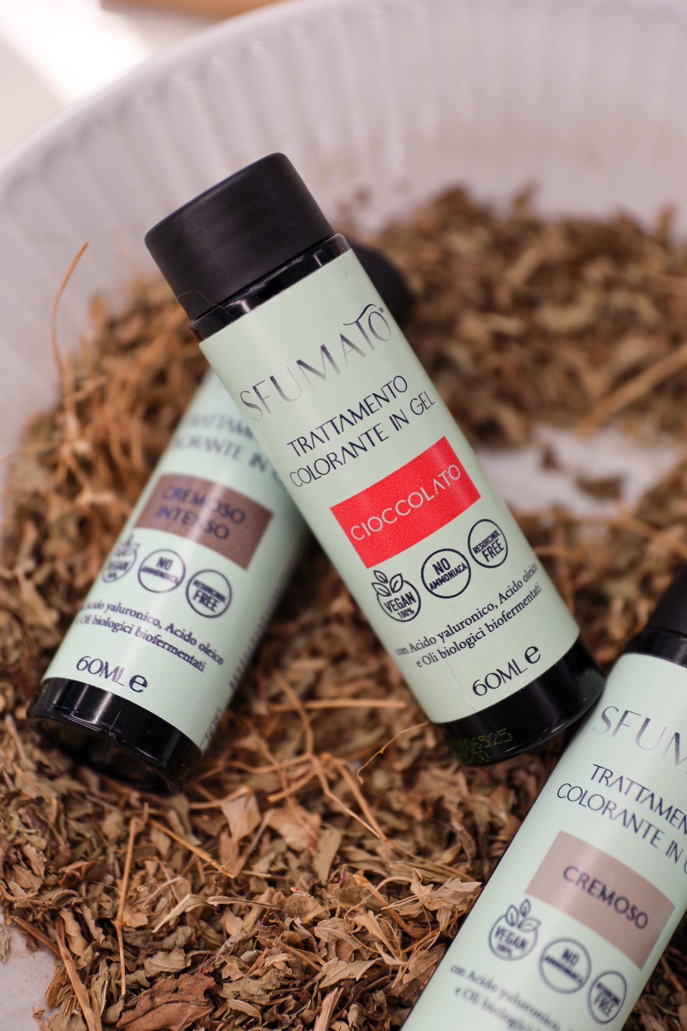 È un trattamento colorante in gel e a base di oli vegetali che, a differenza delle tinte tradizionali che svuotano il capello del suo pigmento naturale, SFUMATO lavora in stratificazione, come fanno le erbe. Hanno lo stesso principio, ma Sfumato è stato creato per essere molto più performante, sia in termine di risultati che di facilità di applicazione.