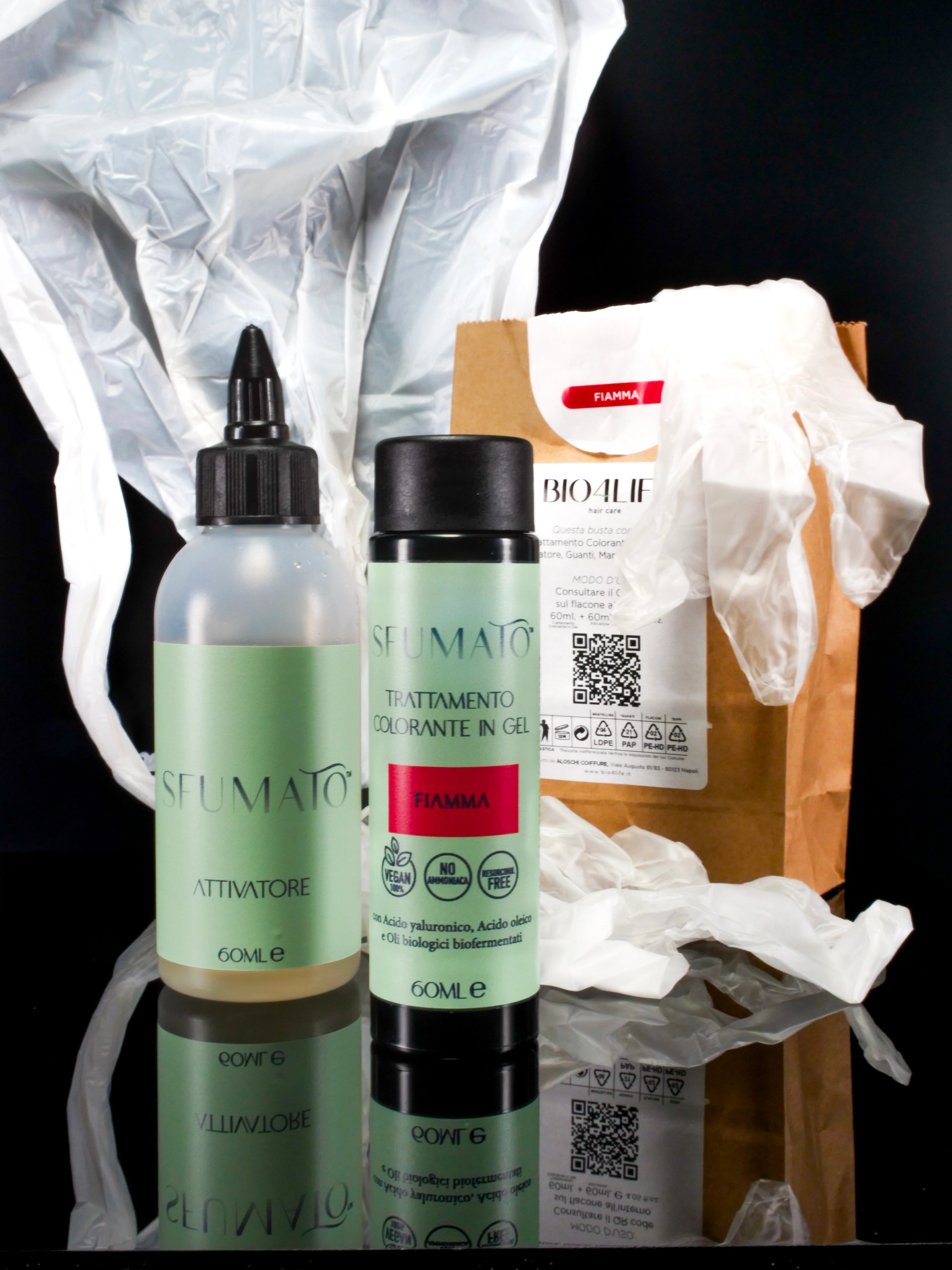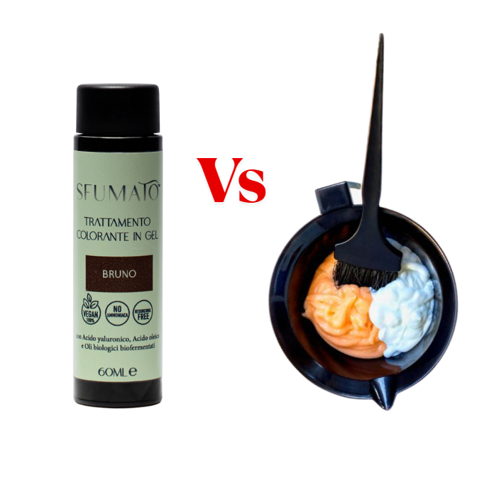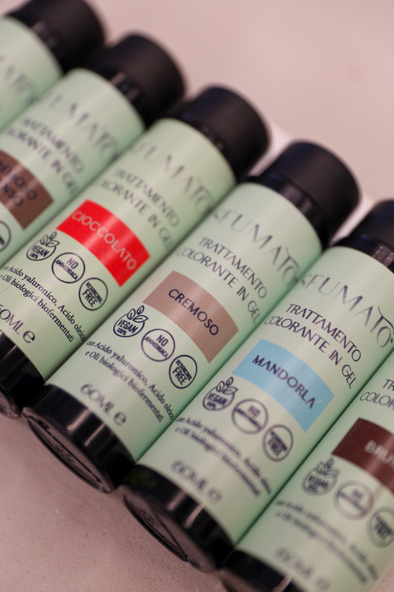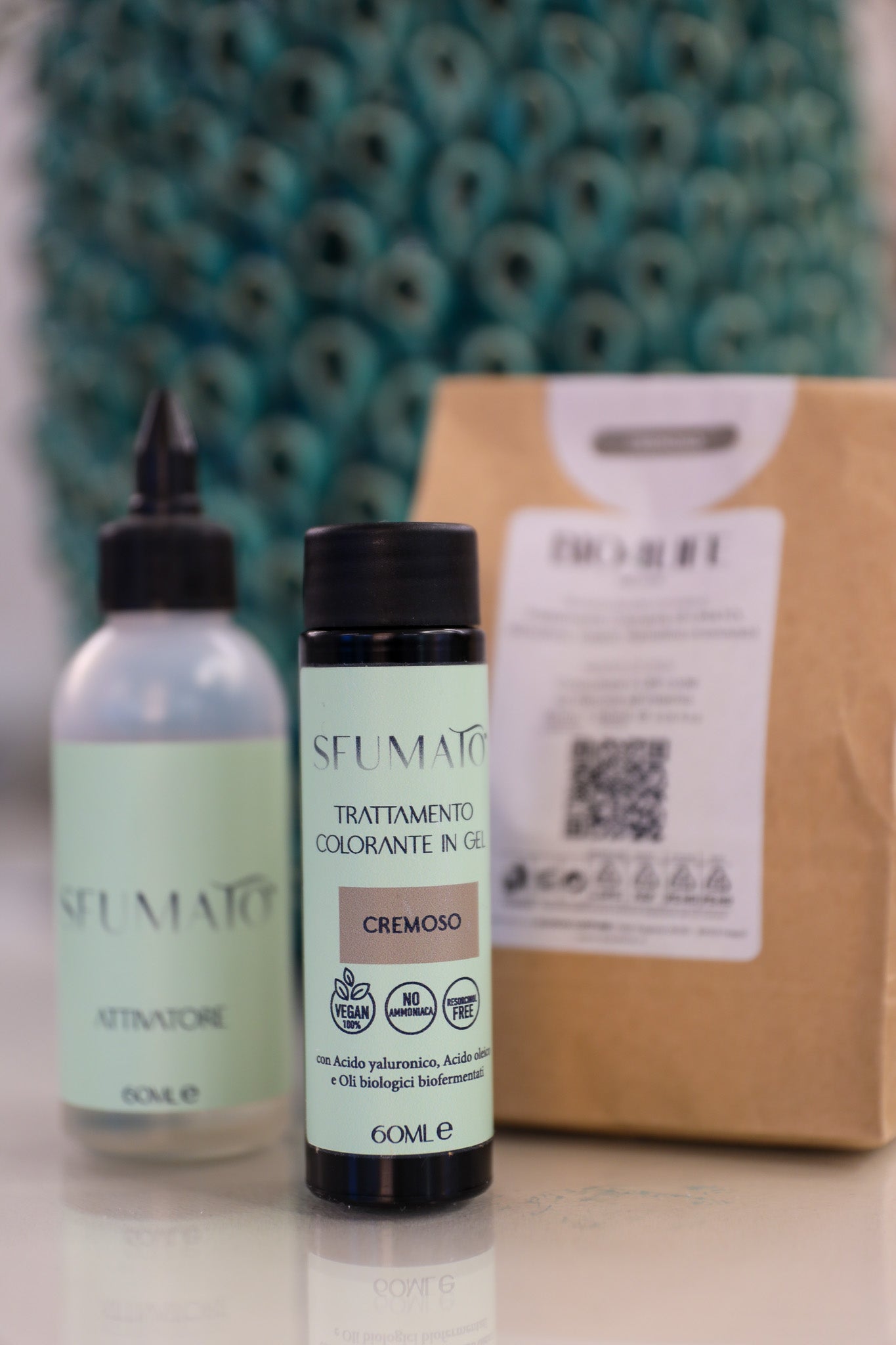 È un trattamento colorante in gel e a base di oli vegetali che, a differenza delle tinte tradizionali che svuotano il capello del suo pigmento naturale, SFUMATO lavora in stratificazione, come fanno le erbe. Hanno lo stesso principio, ma Sfumato è stato creato per essere molto più performante, sia in termine di risultati che di facilità di applicazione.